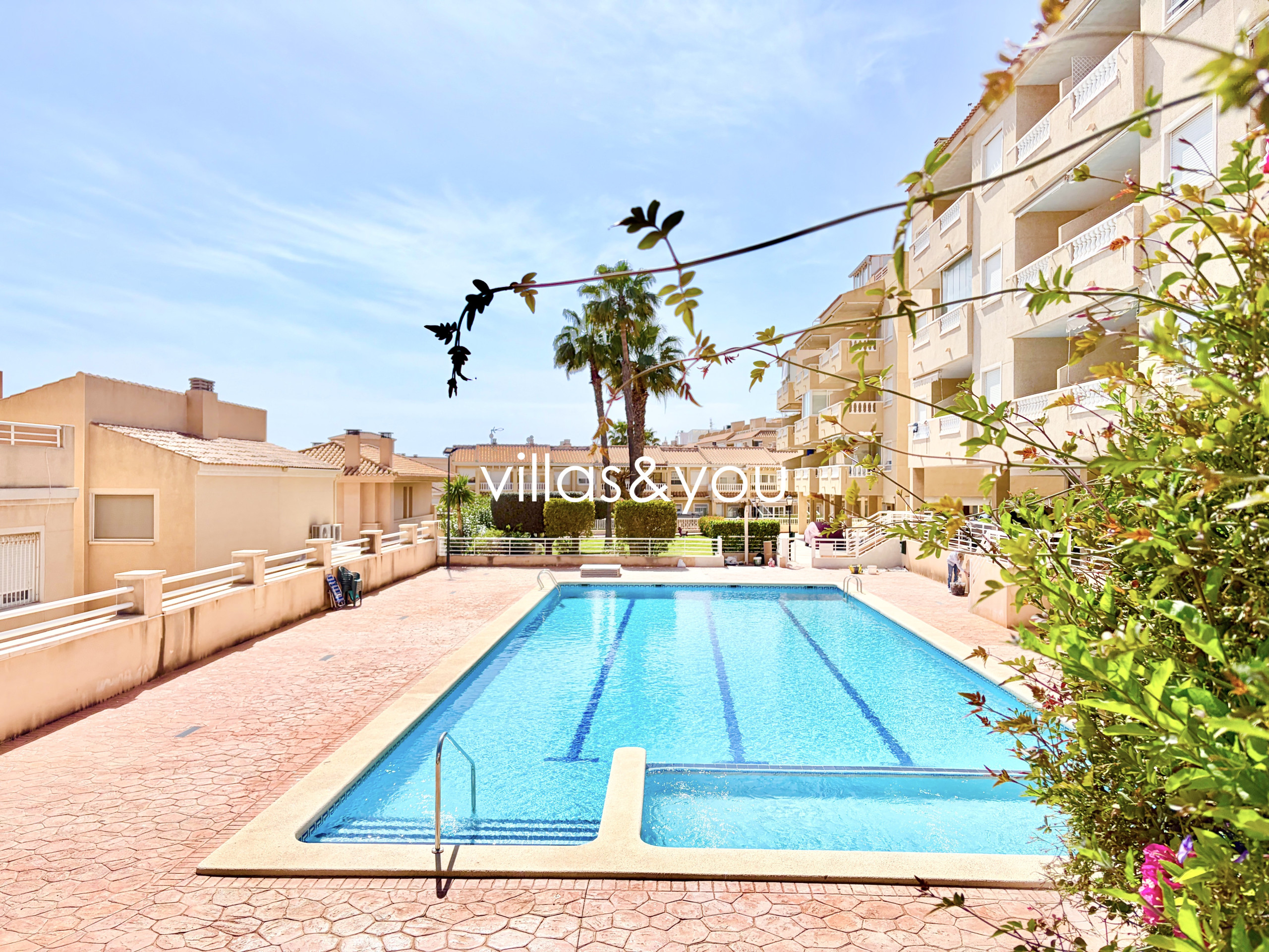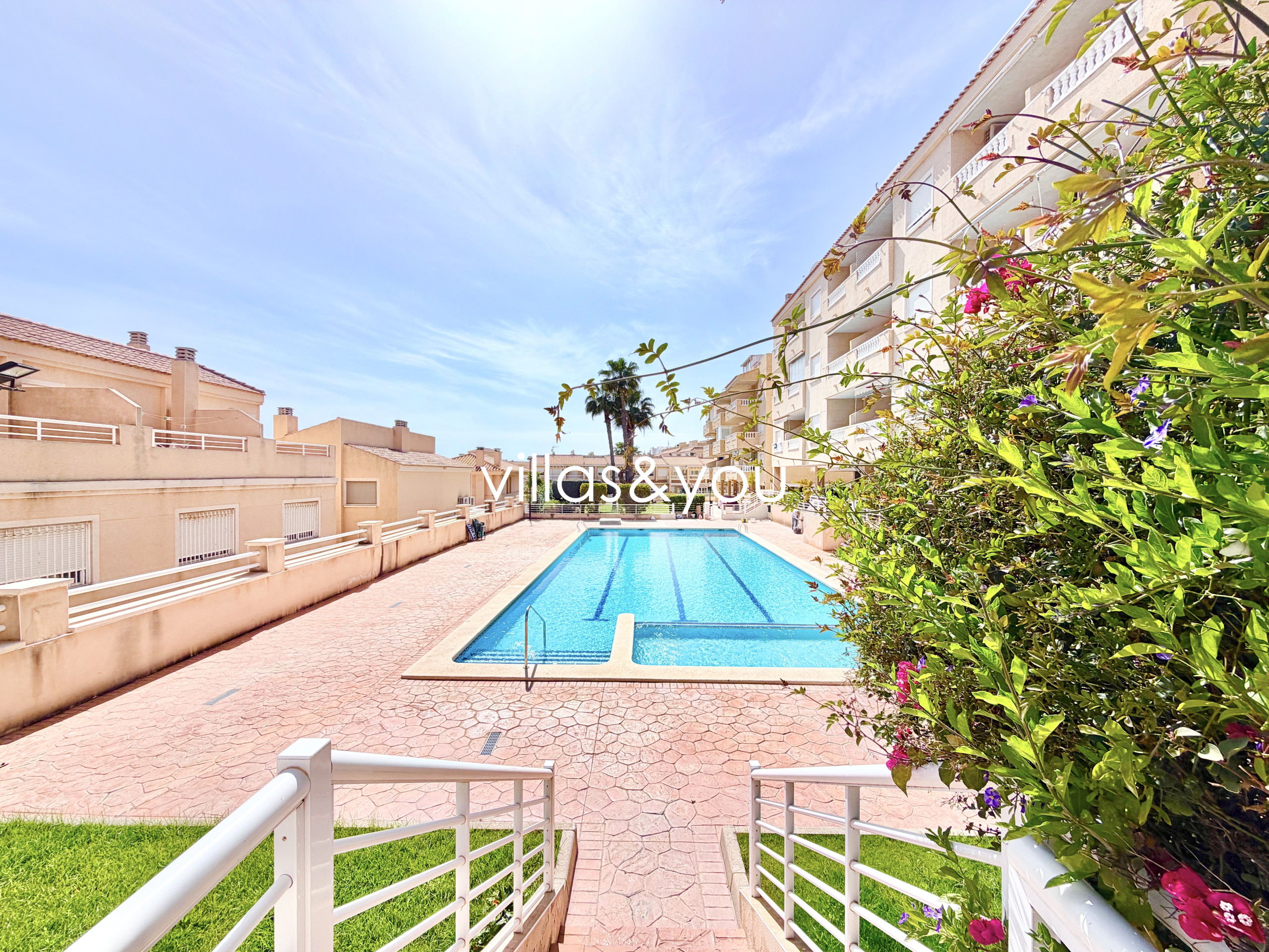 Die Wohnung befindet sich in einem geschlossenen Komplex mit Parkplatz und Gemeinschaftspool.