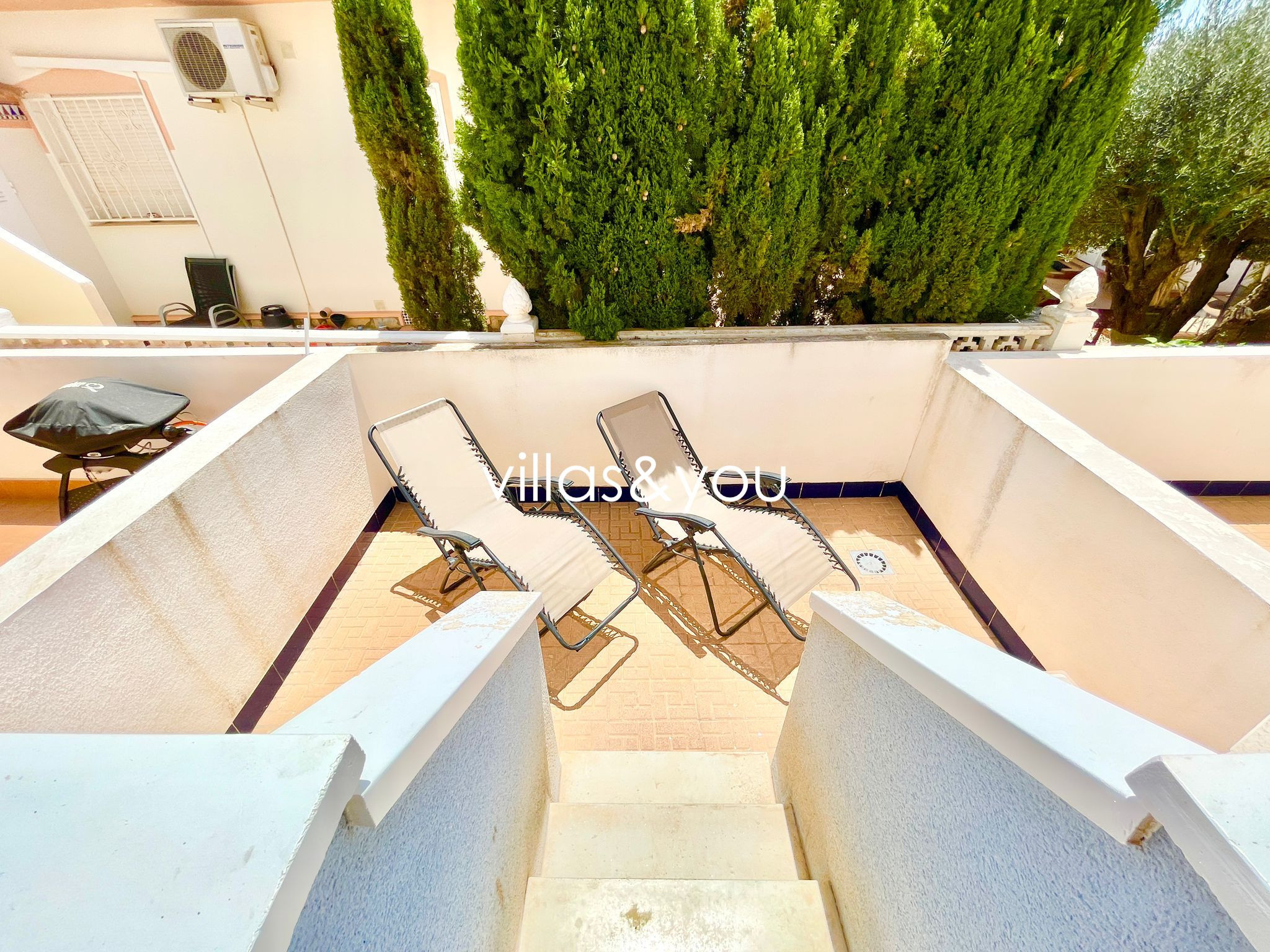 Beide Schlafzimmer befinden sich im Obergeschoss und teilen sich ein großes Familienbadezimmer mit Eckbadewanne / Dusche. Das Hauptschlafzimmer hat auch Zugang zu einer eigenen privaten Terrasse mit Blick auf den Pool.