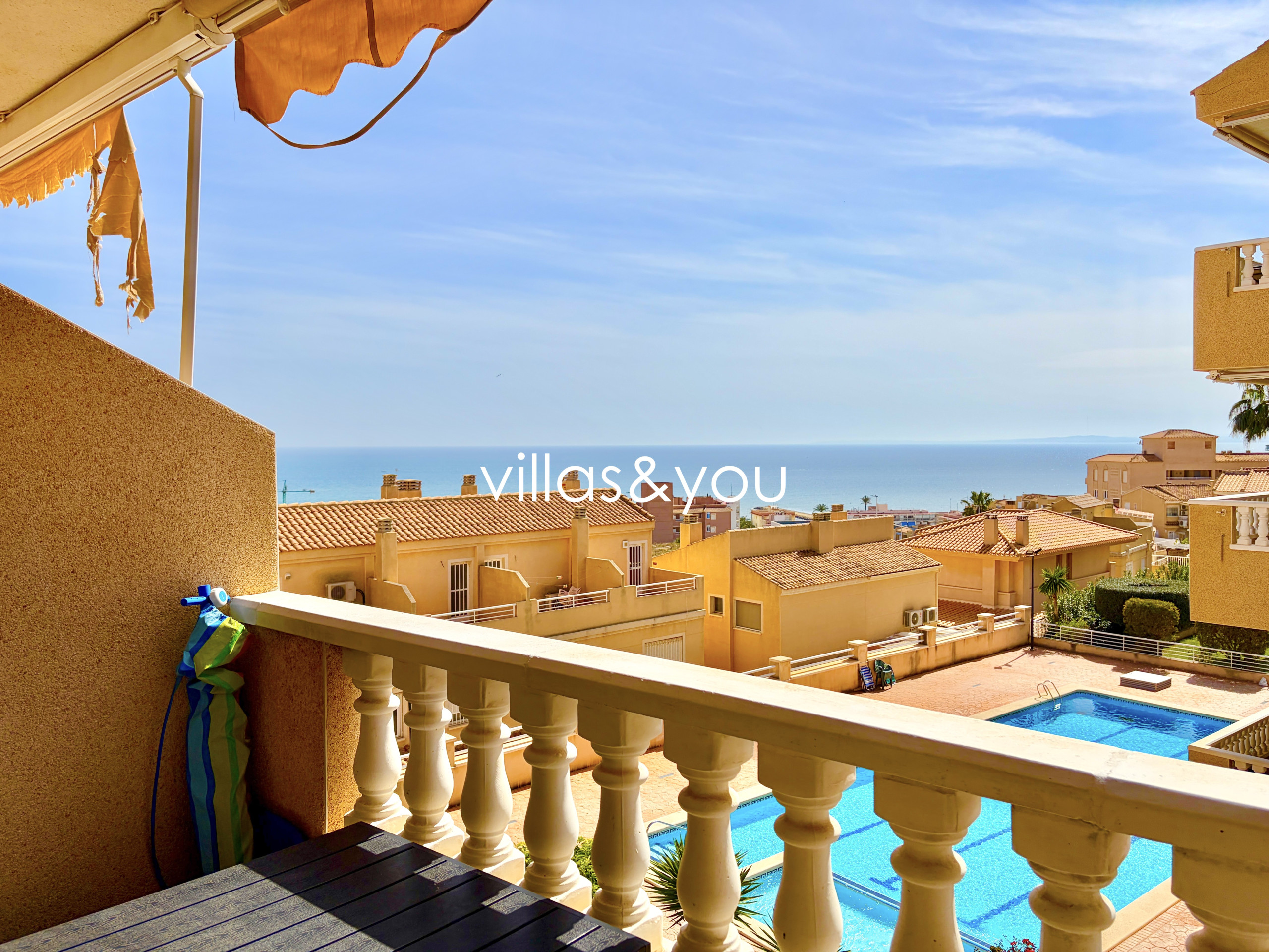 Lägenheten har 2 sovrum, 1 badrum, vardagsrum/matsal med amerikanskt kök och en trevlig terrass med fantastisk utsikt över havet och den gemensamma poolen.